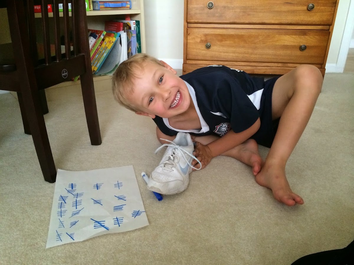 Now that soccer has started and since my cleats have laces, Mommy said I have to learn to tie my shoes. The good news is that she said she would teach me. She said it would take 100 times before it got easier, and the first 20 would be the hardest.